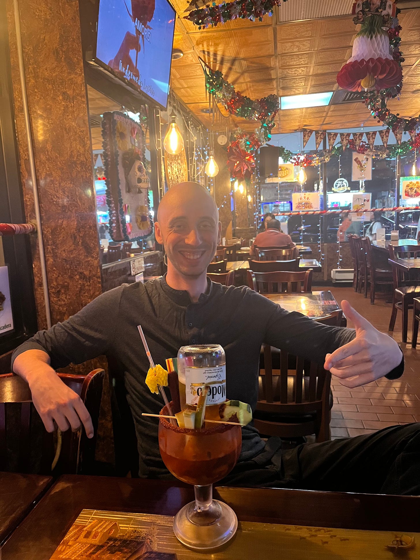 A Michelada is a beer cocktail. Generally, the beer is Modelo or Corona, because those are Mexican beers and it is a Mexican drink. The glass beer bottle is submerged neck-down in a well of lime juice and tequila and hot sauce and sugar. Sometimes there are other flavors—such as mango, which we both had. The rim of the glass is garnished with tajin, and a straw is provided, making the tajin useless. As you drink, the beer slowly drains from the bottle, replenishing the Michelada like an IV bag. It is a drink that gets you drunk.